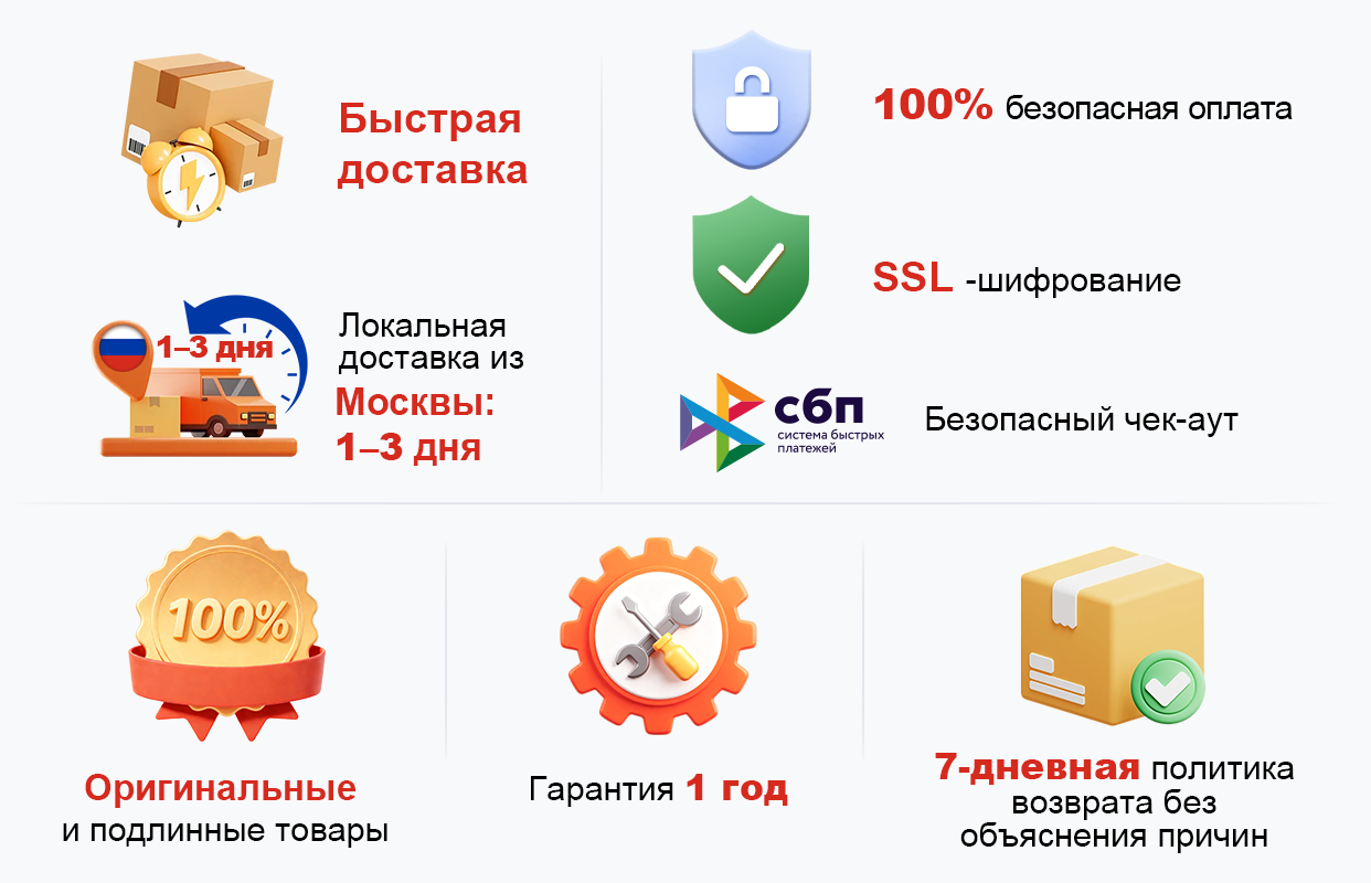 Возможен ли возврат или обмен товара?Да, мы предоставляем возможность безоговорочного возврата или обмена товара в течение 7 дней (при условии, что товар не был использован, сохранены все бирки и оригинальная упаковка в целости).